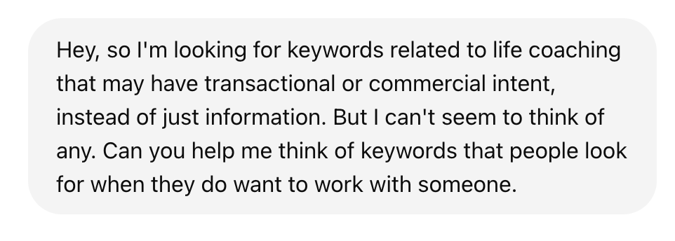 If you don’t know how to come up with commercial keywords in your area (meaning services people are already looking for), you can ask ChatGPT for help. Here’s a screenshot with a (somewhat chaotic) prompt I just tried out.
